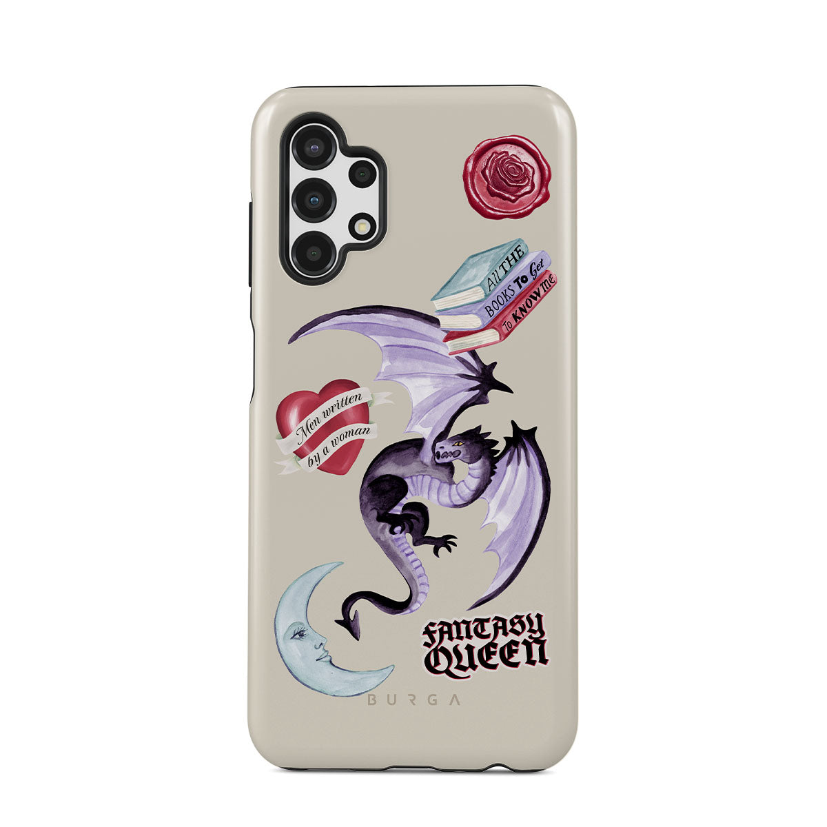 Questo design include: drago viola, sticker "Fantasy Queen", luna crescente, sigillo di cera viola, cuore con messaggio, libri.
