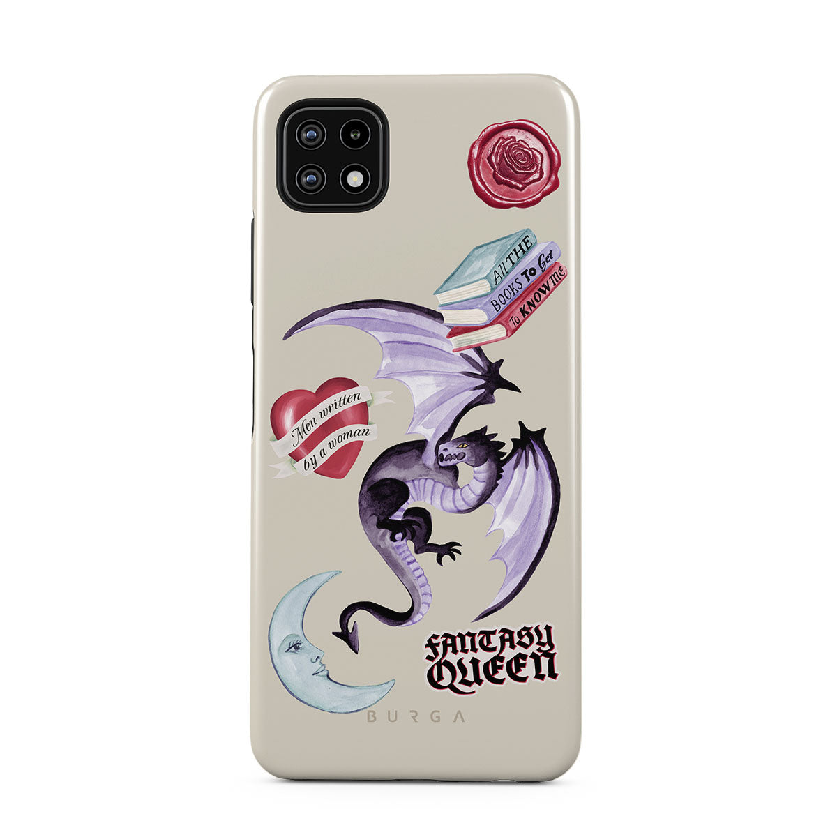 Questo design include: drago viola, sticker "Fantasy Queen", luna crescente, sigillo di cera viola, cuore con messaggio, libri.