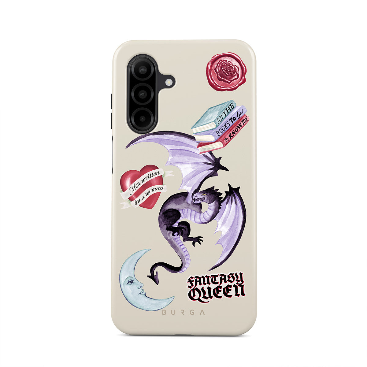 Questo design include: drago viola, sticker "Fantasy Queen", luna crescente, sigillo di cera viola, cuore con messaggio, libri.