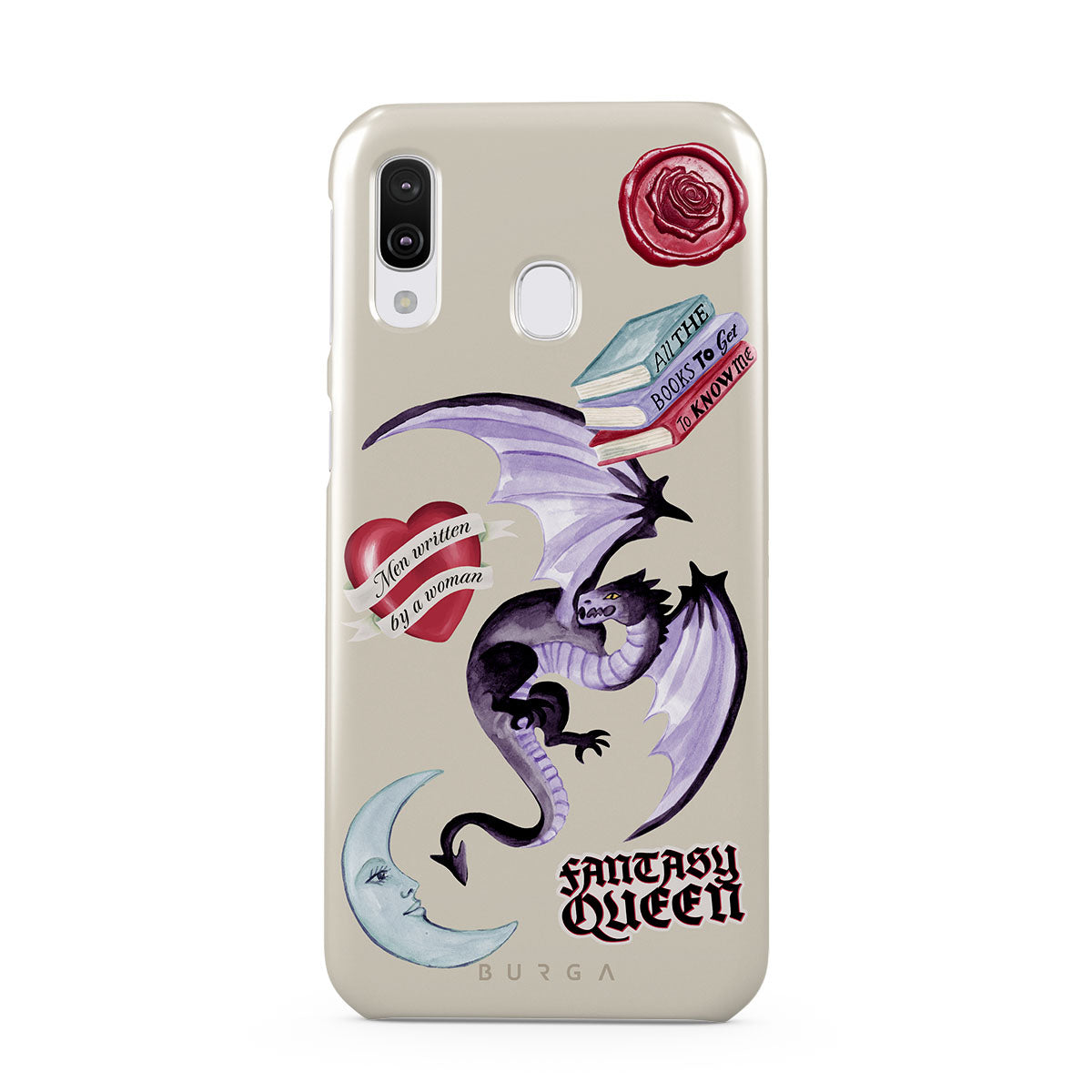 Questo design include: drago viola, sticker "Fantasy Queen", luna crescente, sigillo di cera viola, cuore con messaggio, libri.
