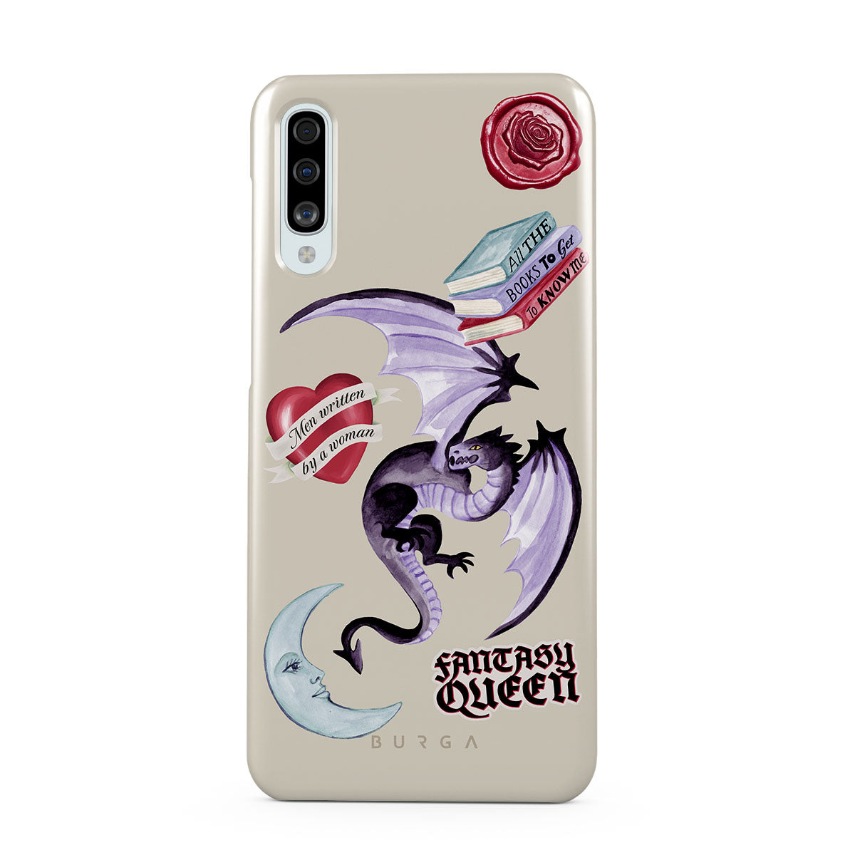 Questo design include: drago viola, sticker "Fantasy Queen", luna crescente, sigillo di cera viola, cuore con messaggio, libri.