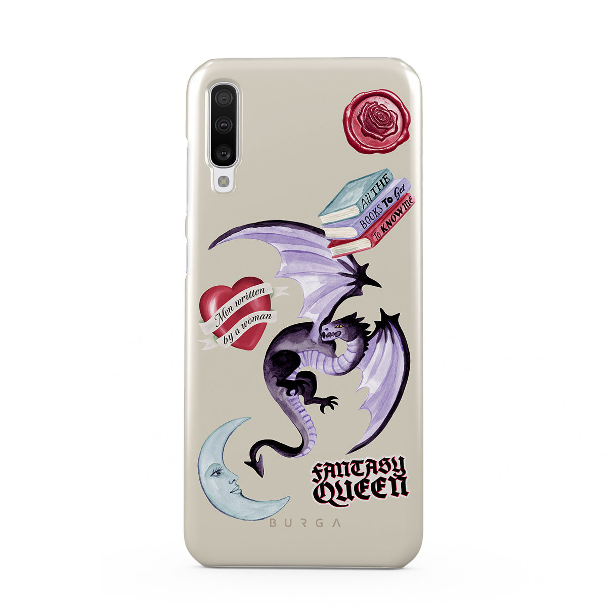 Questo design include: drago viola, sticker "Fantasy Queen", luna crescente, sigillo di cera viola, cuore con messaggio, libri.