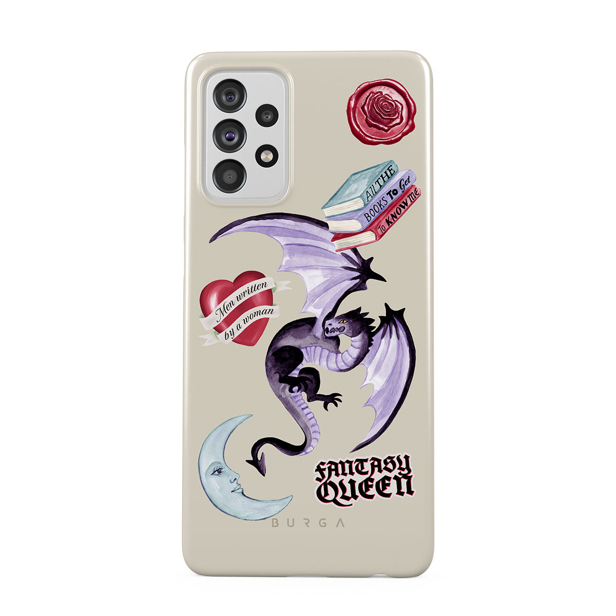 Questo design include: drago viola, sticker "Fantasy Queen", luna crescente, sigillo di cera viola, cuore con messaggio, libri.