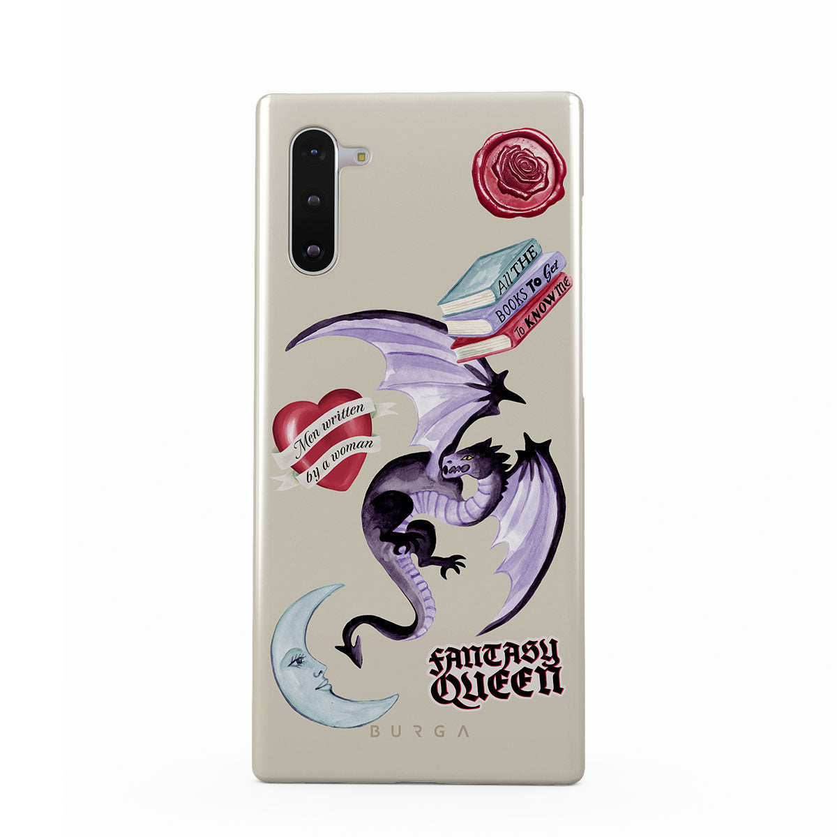 Questo design include: drago viola, sticker "Fantasy Queen", luna crescente, sigillo di cera viola, cuore con messaggio, libri.
