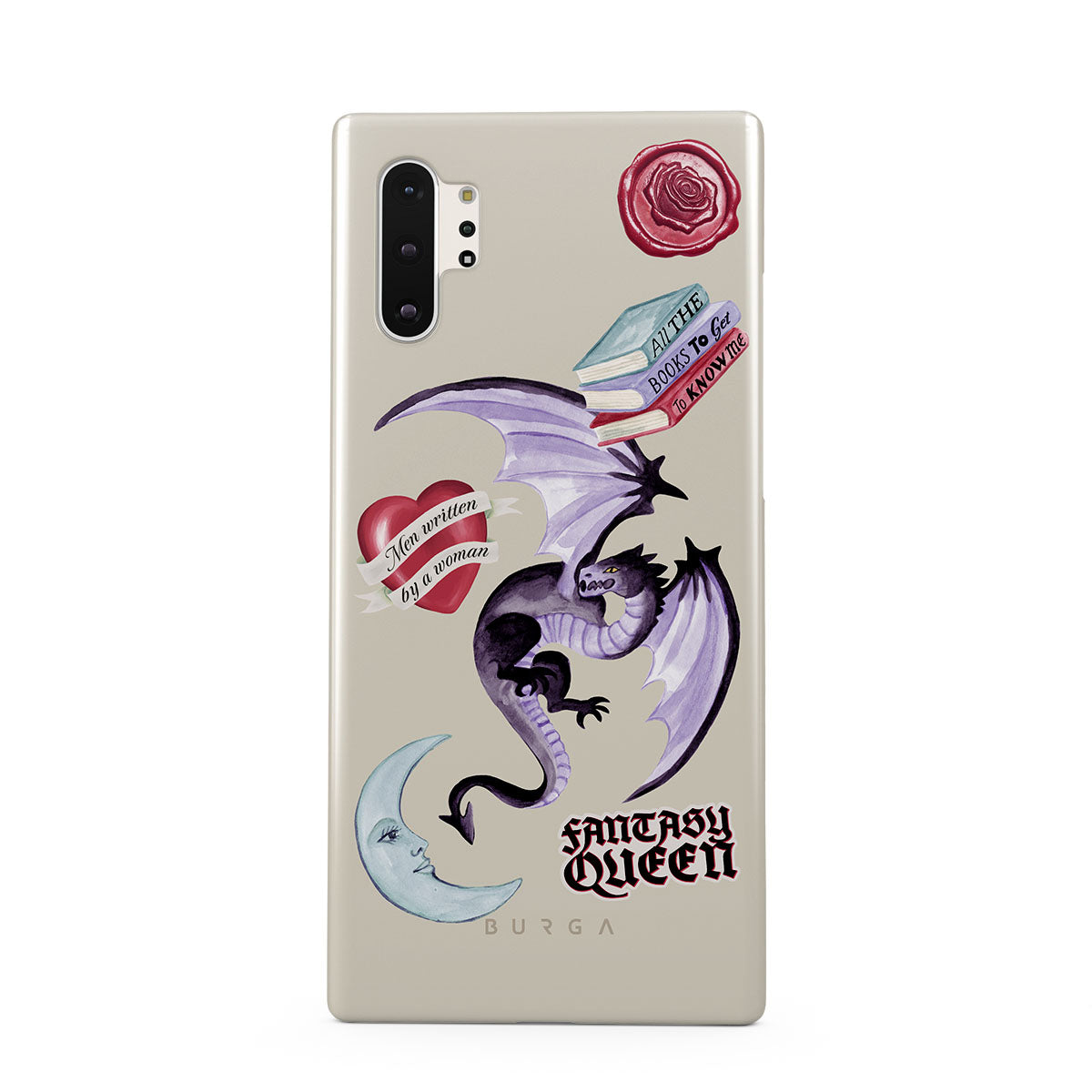 Questo design include: drago viola, sticker "Fantasy Queen", luna crescente, sigillo di cera viola, cuore con messaggio, libri.