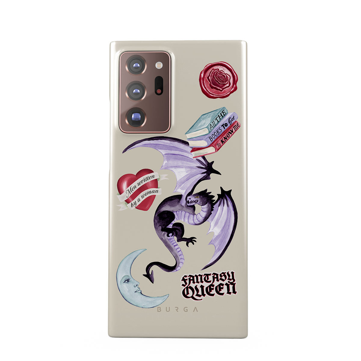 Questo design include: drago viola, sticker "Fantasy Queen", luna crescente, sigillo di cera viola, cuore con messaggio, libri.