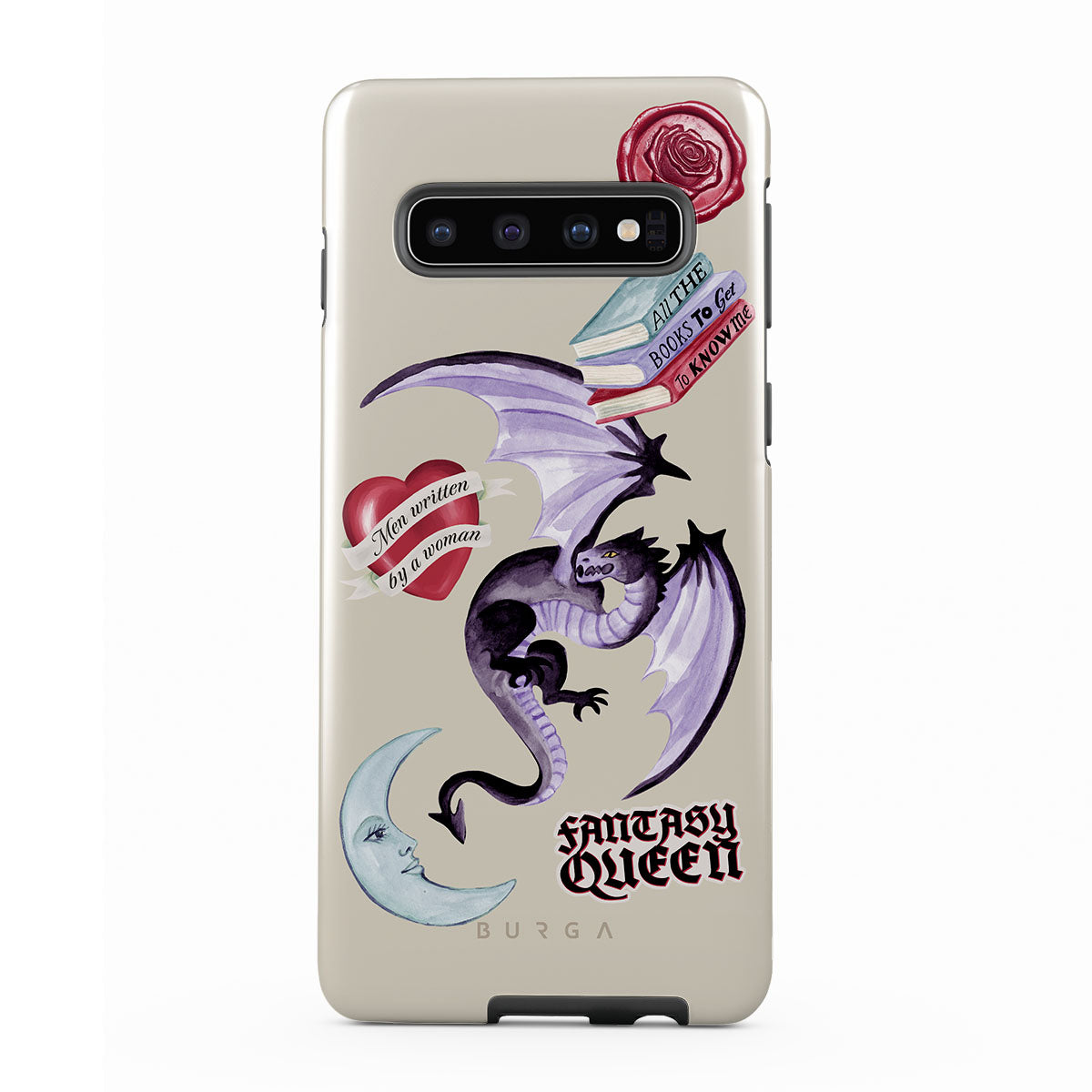 Questo design include: drago viola, sticker "Fantasy Queen", luna crescente, sigillo di cera viola, cuore con messaggio, libri.