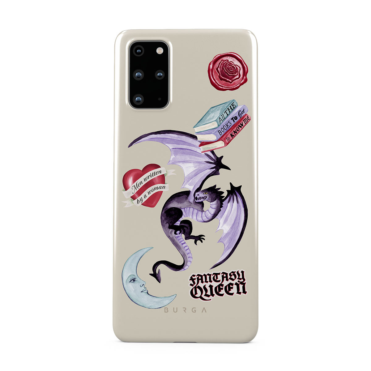 Questo design include: drago viola, sticker "Fantasy Queen", luna crescente, sigillo di cera viola, cuore con messaggio, libri.