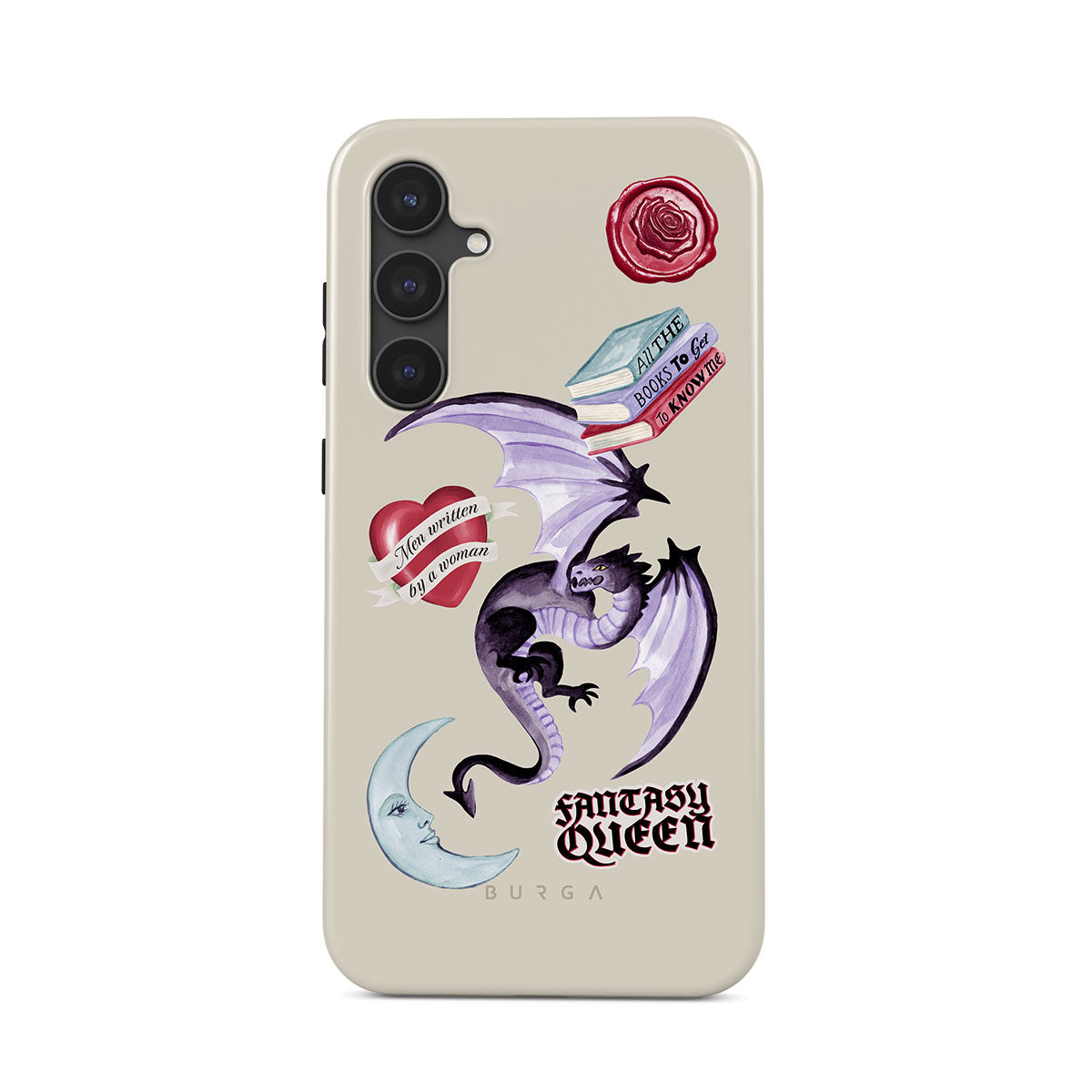 Questo design include: drago viola, sticker "Fantasy Queen", luna crescente, sigillo di cera viola, cuore con messaggio, libri.