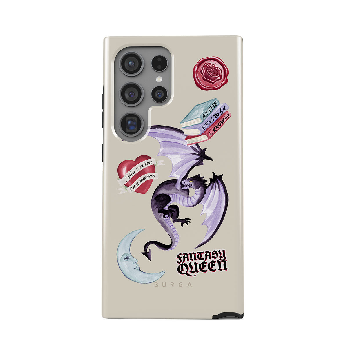 Questo design include: drago viola, sticker "Fantasy Queen", luna crescente, sigillo di cera viola, cuore con messaggio, libri.