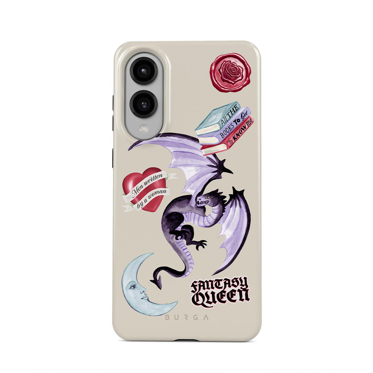 Questo design include: drago viola, sticker "Fantasy Queen", luna crescente, sigillo di cera viola, cuore con messaggio, libri.