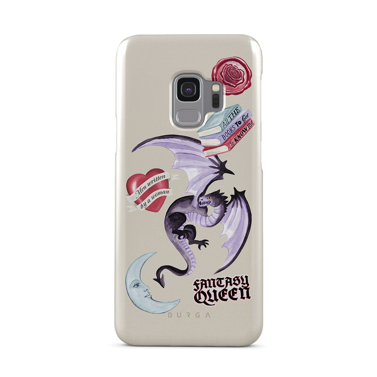 Questo design include: drago viola, sticker "Fantasy Queen", luna crescente, sigillo di cera viola, cuore con messaggio, libri.