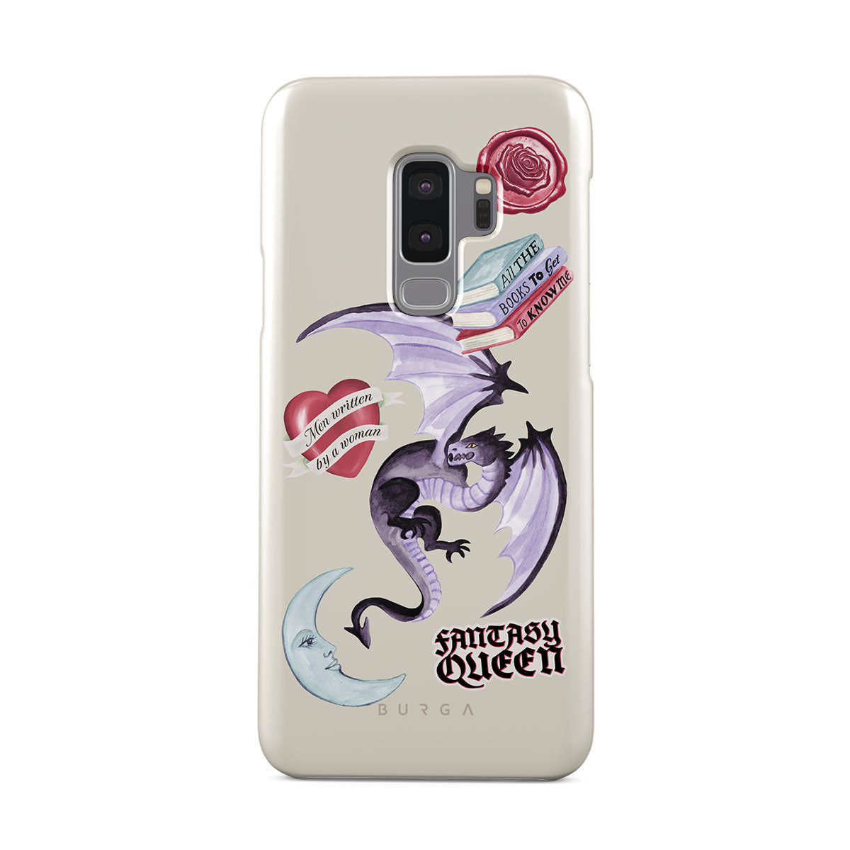 Questo design include: drago viola, sticker "Fantasy Queen", luna crescente, sigillo di cera viola, cuore con messaggio, libri.