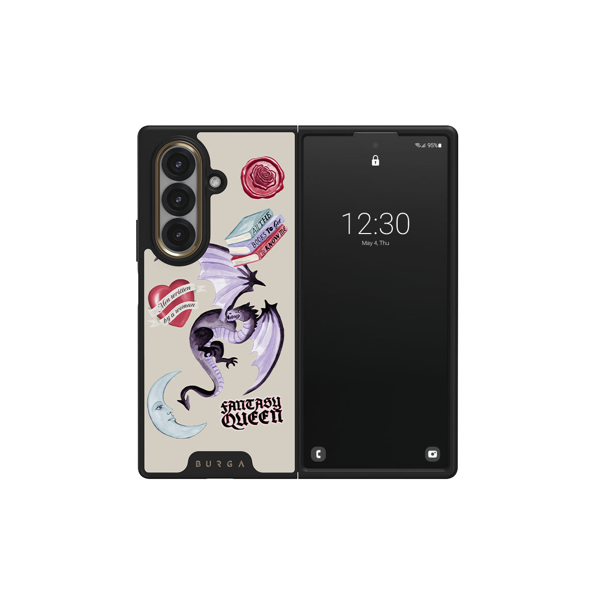 Questo design include: drago viola, sticker "Fantasy Queen", luna crescente, sigillo di cera viola, cuore con messaggio, libri.