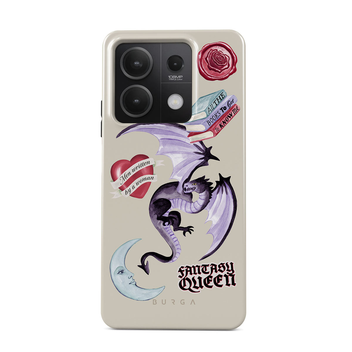 Questo design include: drago viola, sticker "Fantasy Queen", luna crescente, sigillo di cera viola, cuore con messaggio, libri.