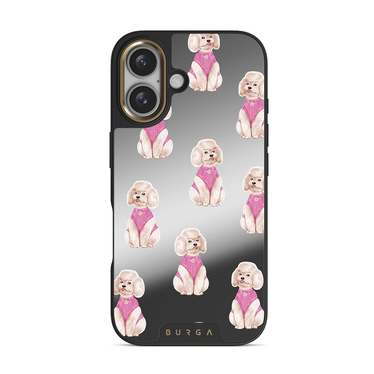 Questo design include: barboncini, cani, animali domestici, dettagli rosa, specchio
