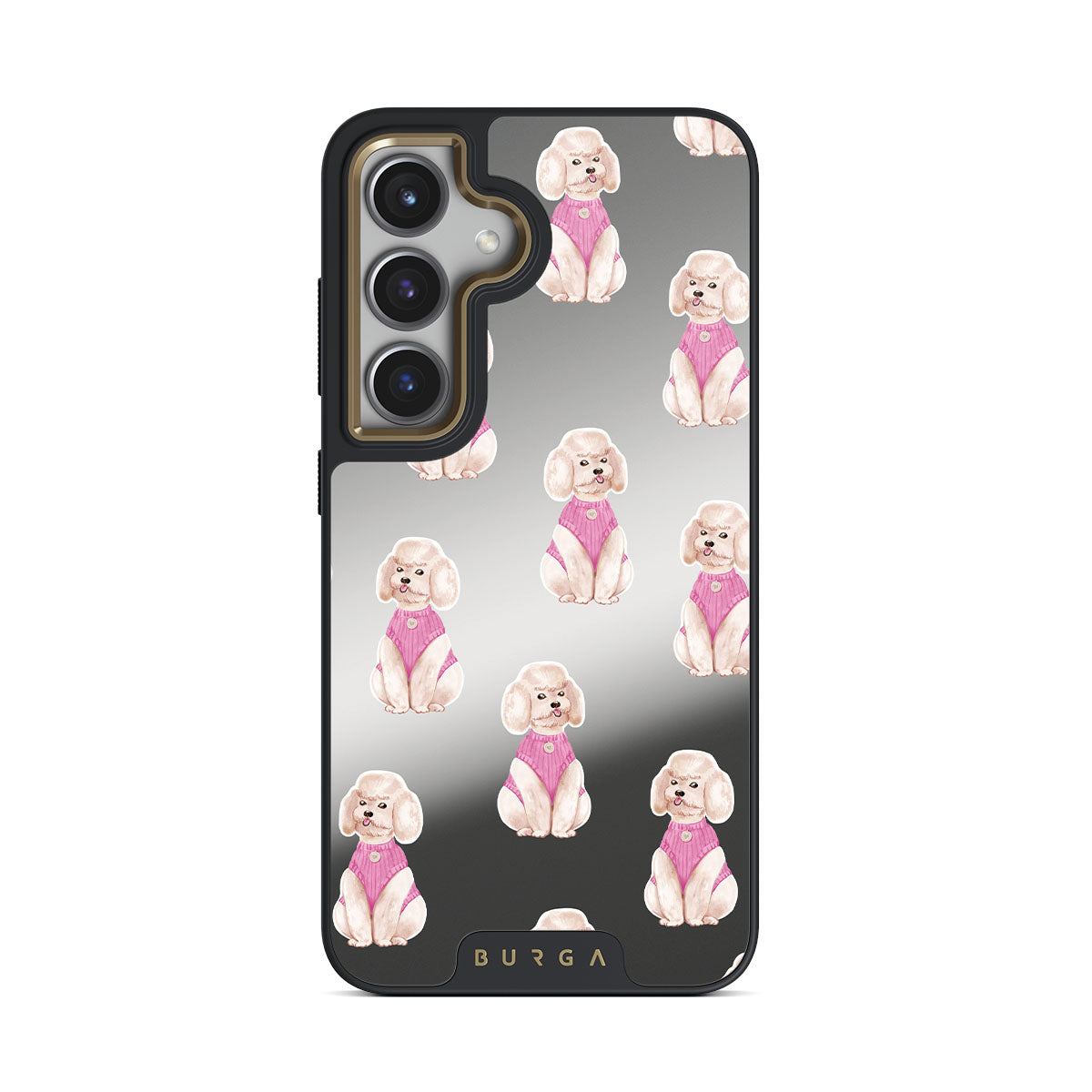Questo design include: barboncini, cani, animali domestici, dettagli rosa, specchio
