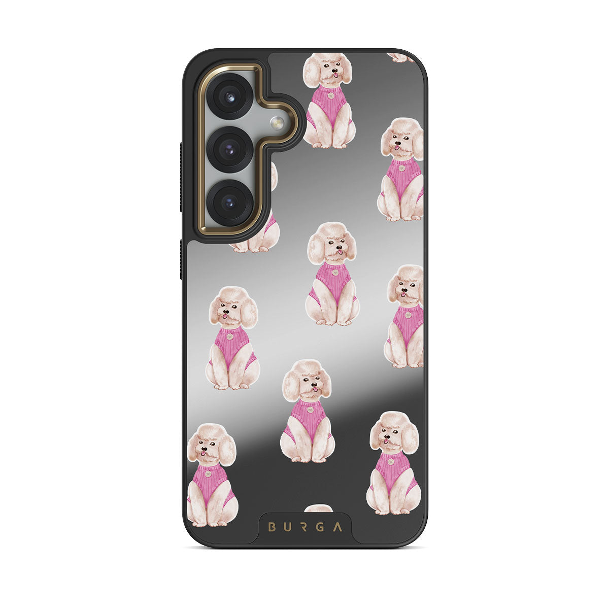 Questo design include: barboncini, cani, animali domestici, dettagli rosa, specchio