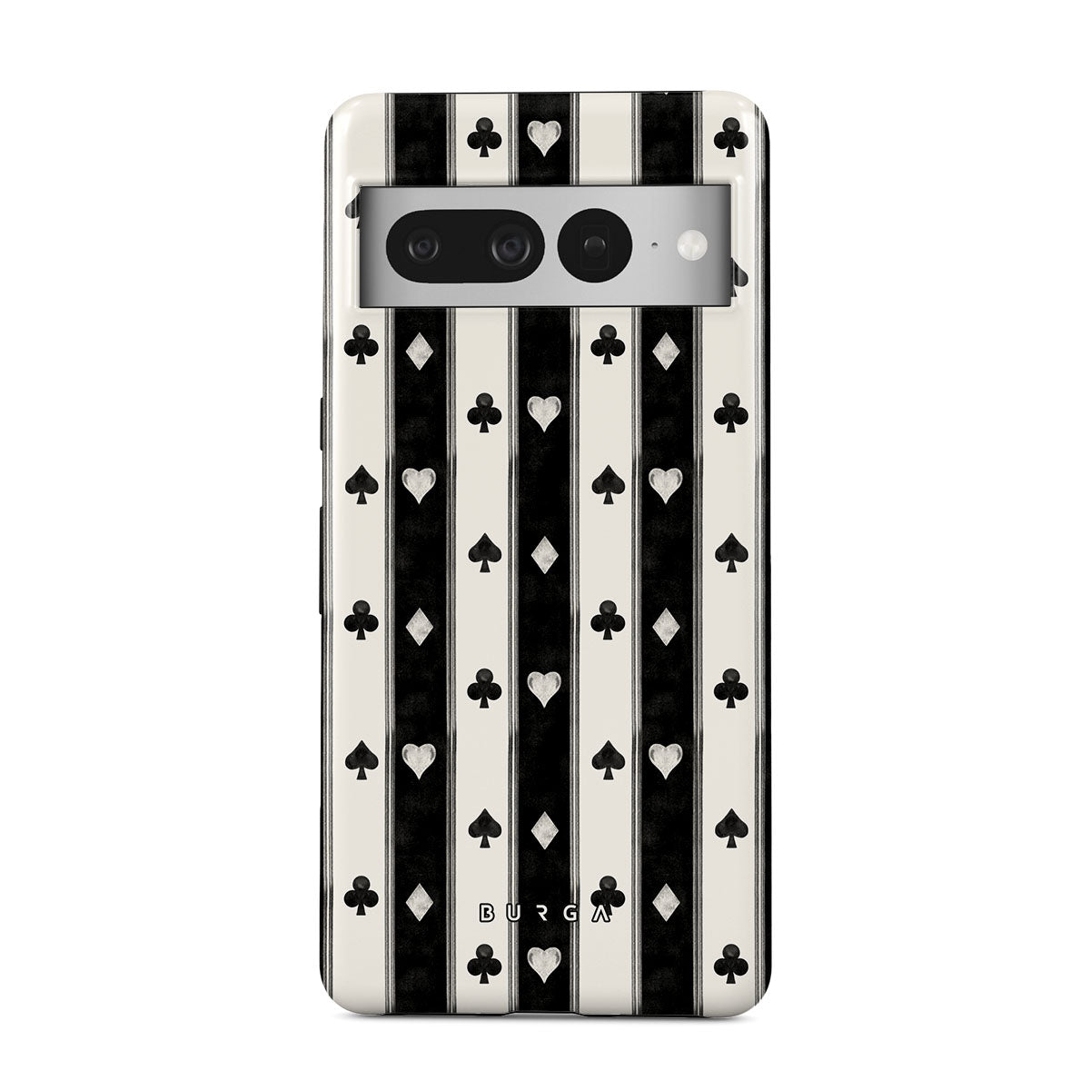 Questo design include: strisce nere e bianche, cuori, semi delle carte, stile vintage