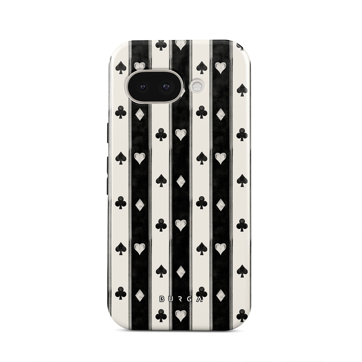 Questo design include: strisce nere e bianche, cuori, semi delle carte, stile vintage