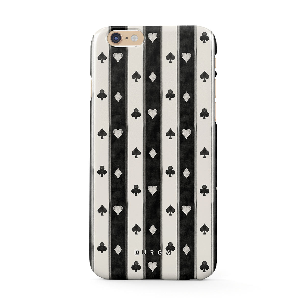 Questo design include: strisce nere e bianche, cuori, semi delle carte, stile vintage