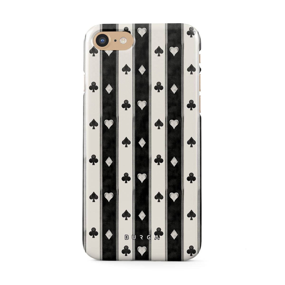 Questo design include: strisce nere e bianche, cuori, semi delle carte, stile vintage