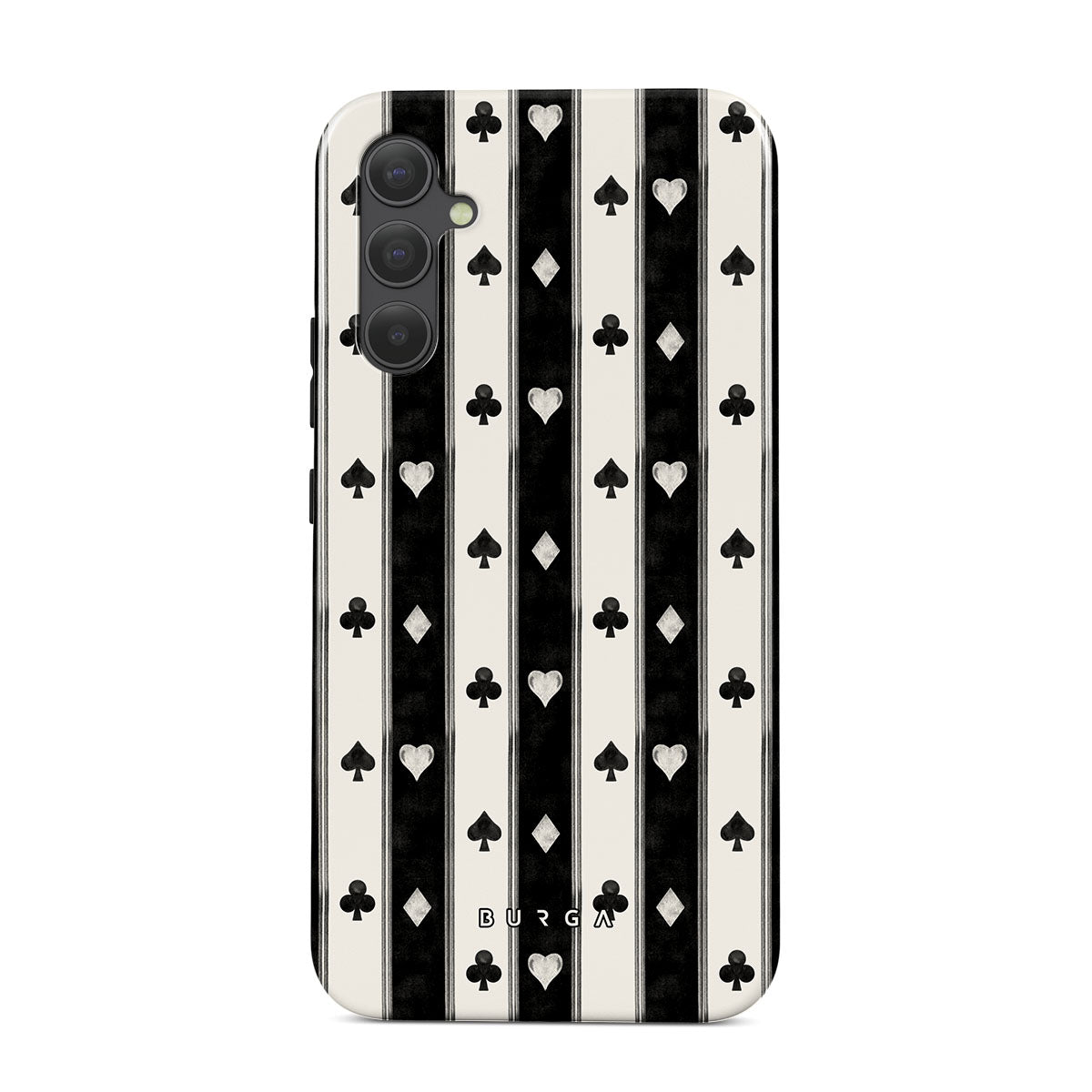 Questo design include: strisce nere e bianche, cuori, semi delle carte, stile vintage