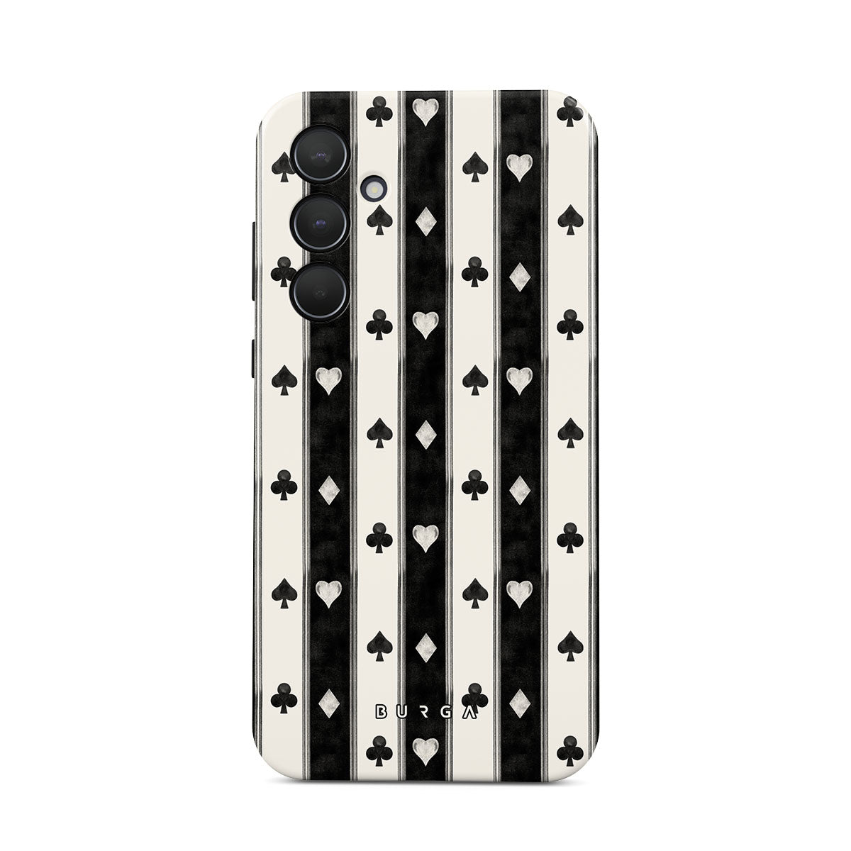 Questo design include: strisce nere e bianche, cuori, semi delle carte, stile vintage