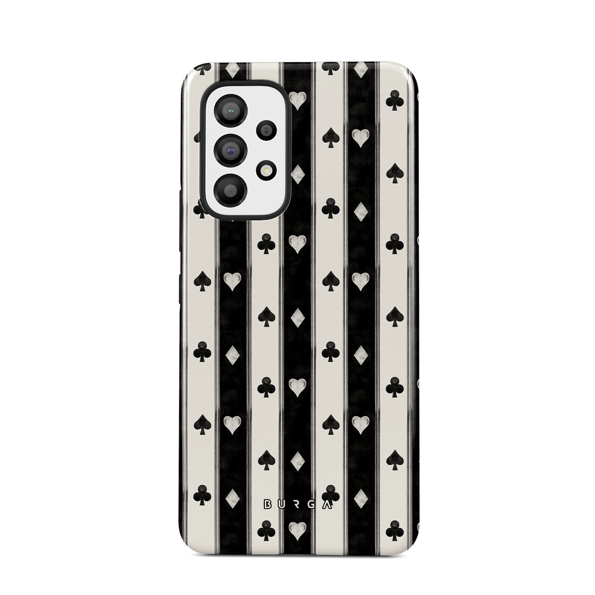 Questo design include: strisce nere e bianche, cuori, semi delle carte, stile vintage