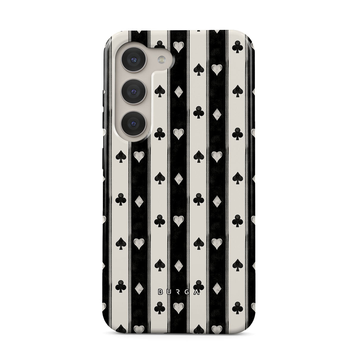 Questo design include: strisce nere e bianche, cuori, semi delle carte, stile vintage