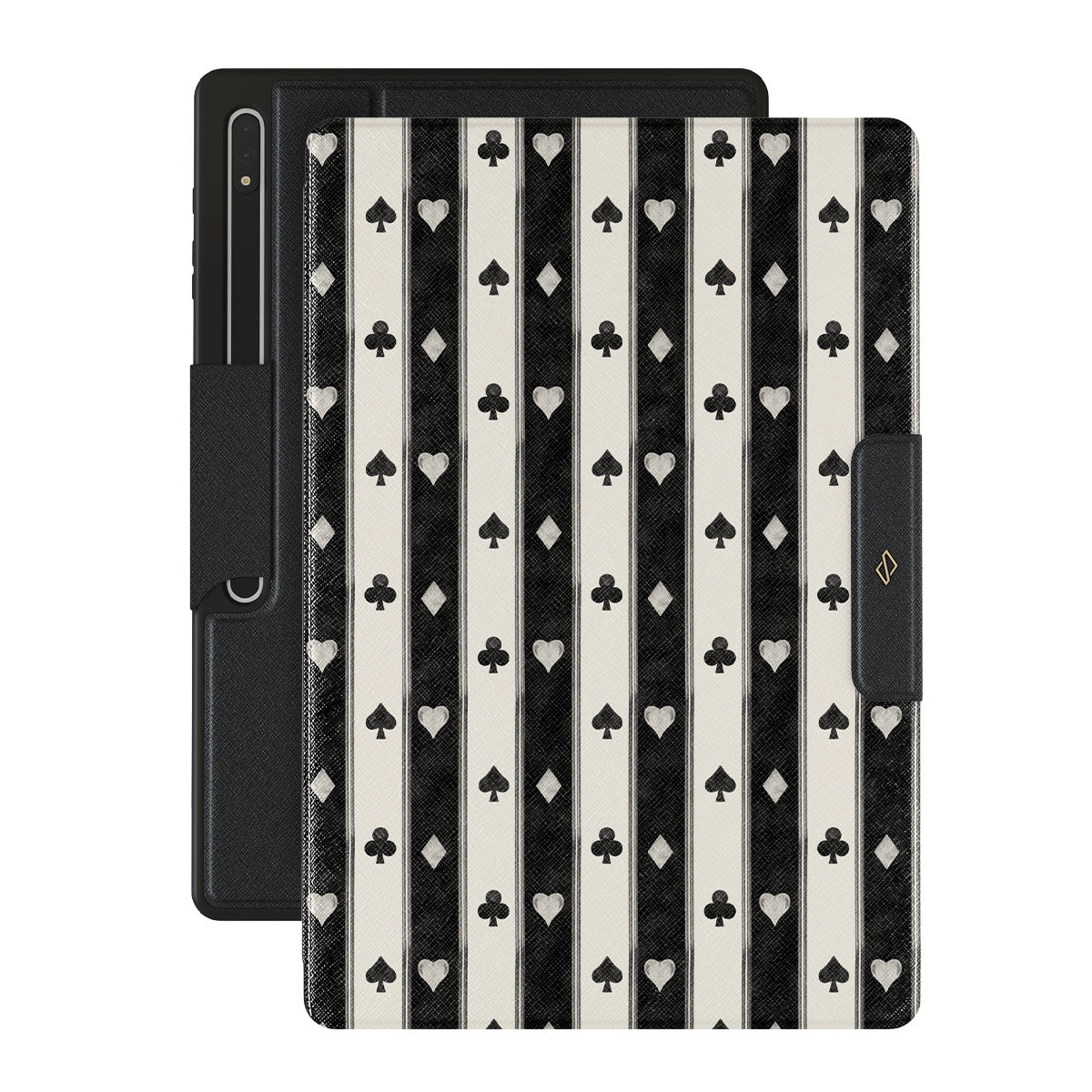 Questo design include: strisce nere e bianche, cuori, semi delle carte, stile vintage