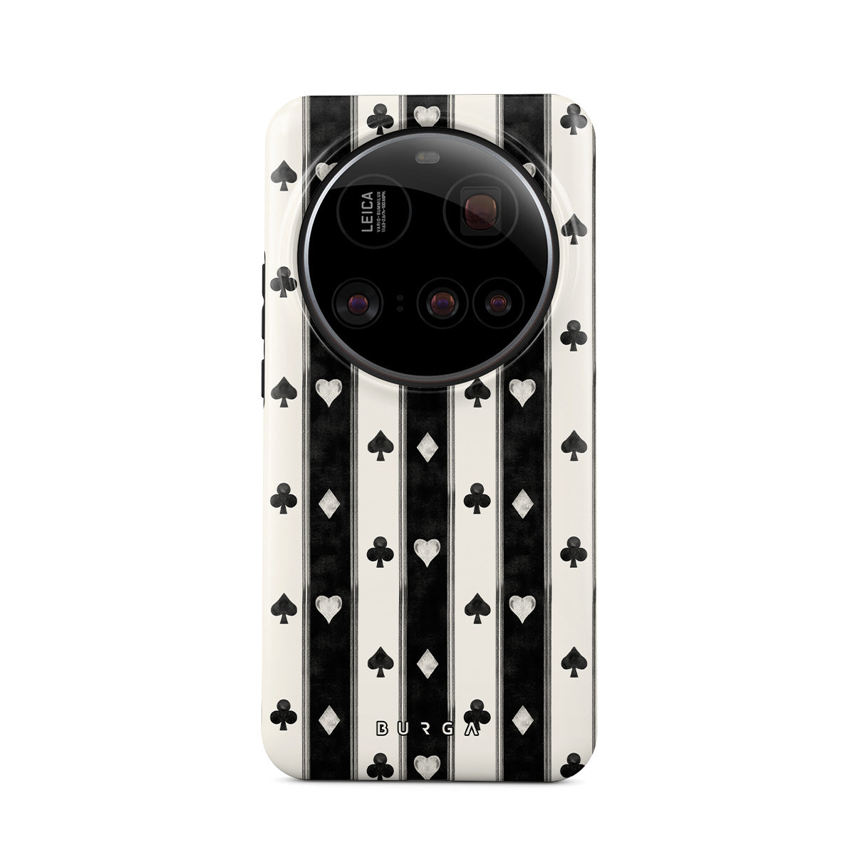 Questo design include: strisce nere e bianche, cuori, semi delle carte, stile vintage