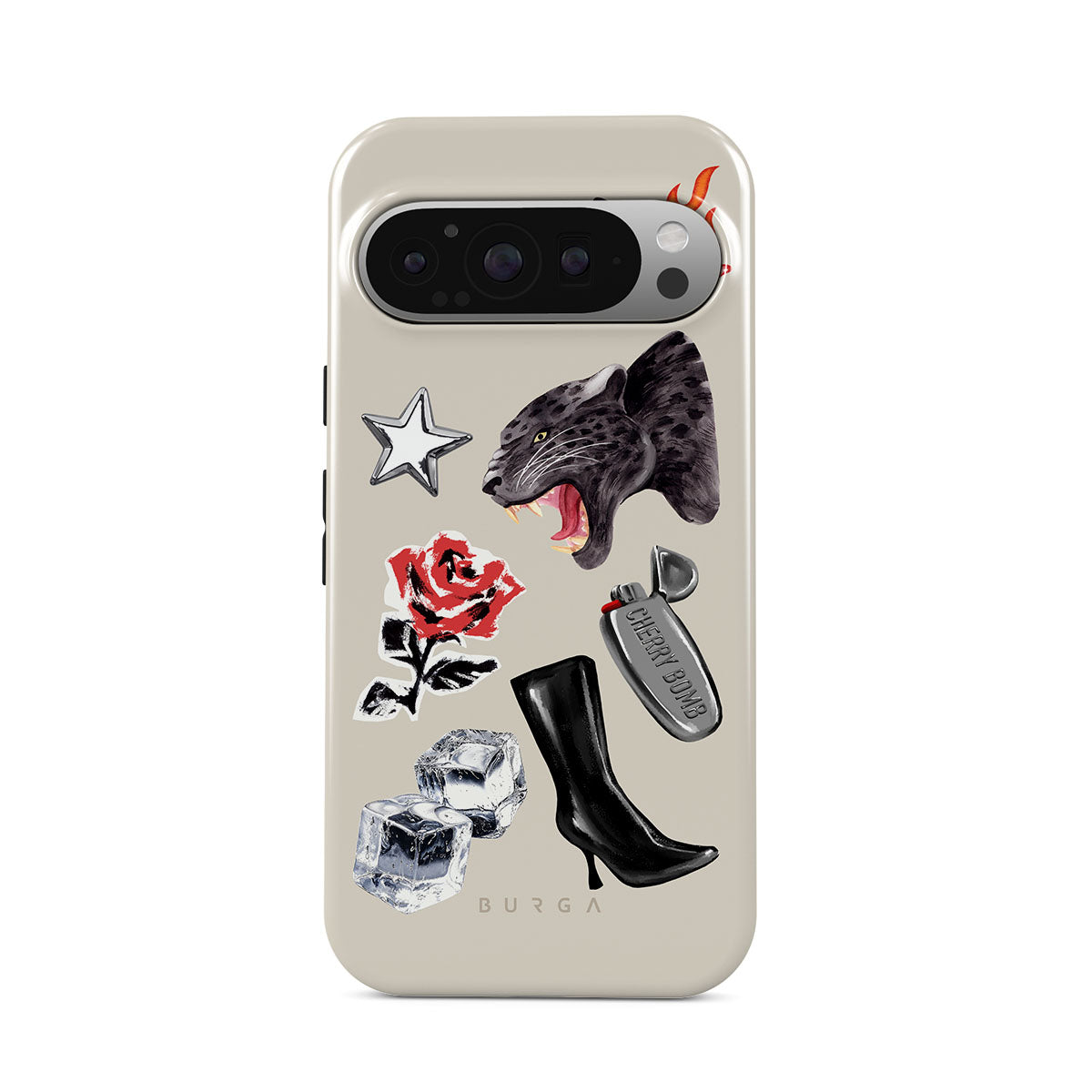 Questo design include: pantera nera, rosa rossa, peperone in fiamme, accendino argento, stivali neri alti, cubetti di ghiaccio, stella d’argento.
