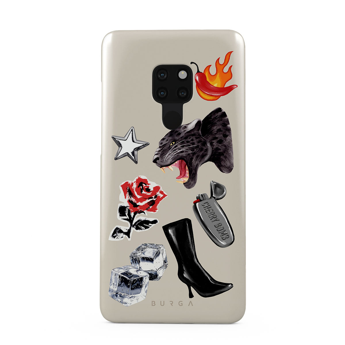 Questo design include: pantera nera, rosa rossa, peperone in fiamme, accendino argento, stivali neri alti, cubetti di ghiaccio, stella d’argento.
