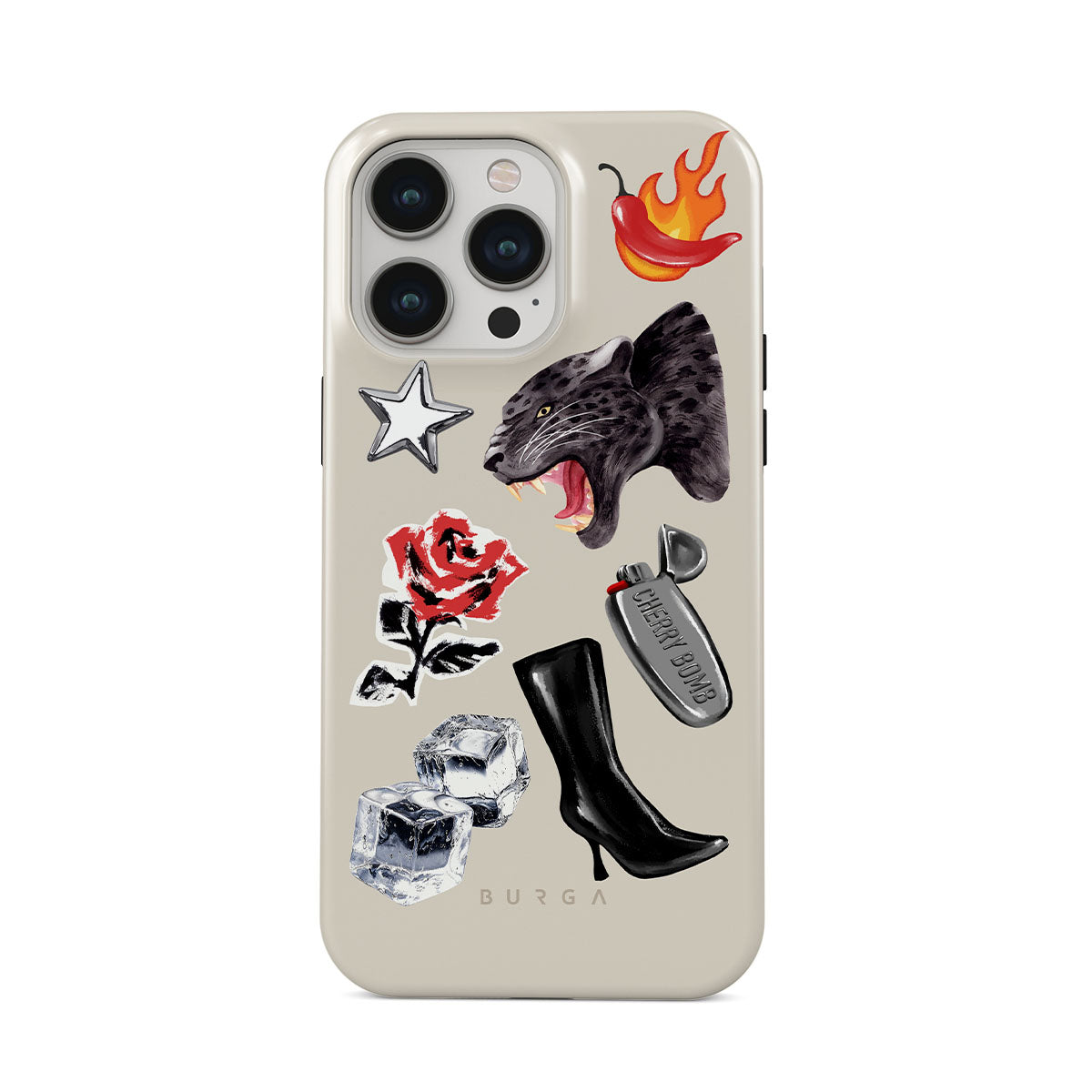 Questo design include: pantera nera, rosa rossa, peperone in fiamme, accendino argento, stivali neri alti, cubetti di ghiaccio, stella d’argento.