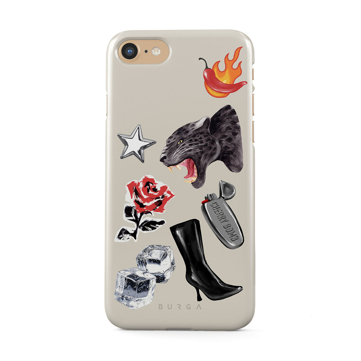 Questo design include: pantera nera, rosa rossa, peperone in fiamme, accendino argento, stivali neri alti, cubetti di ghiaccio, stella d’argento.