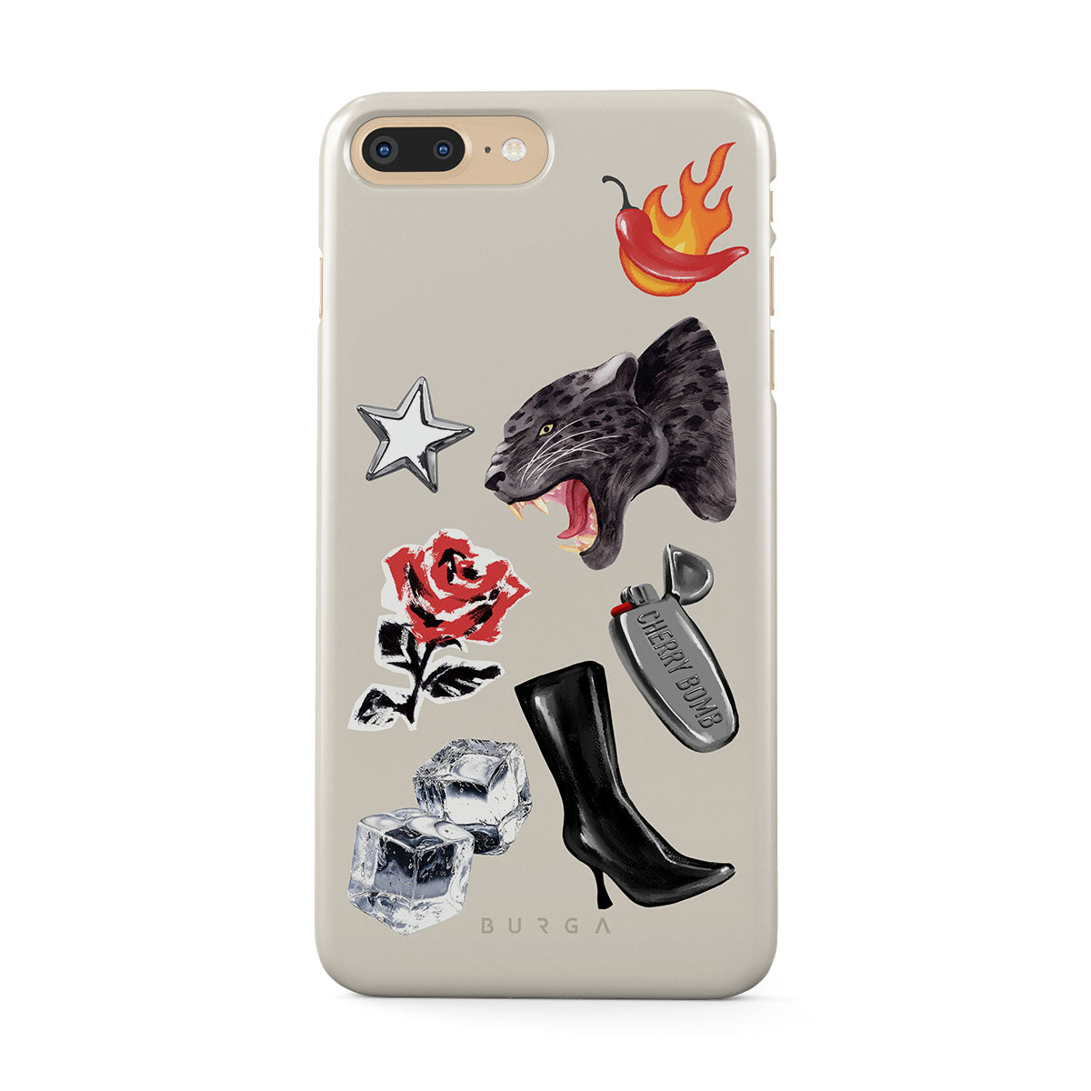 Questo design include: pantera nera, rosa rossa, peperone in fiamme, accendino argento, stivali neri alti, cubetti di ghiaccio, stella d’argento.