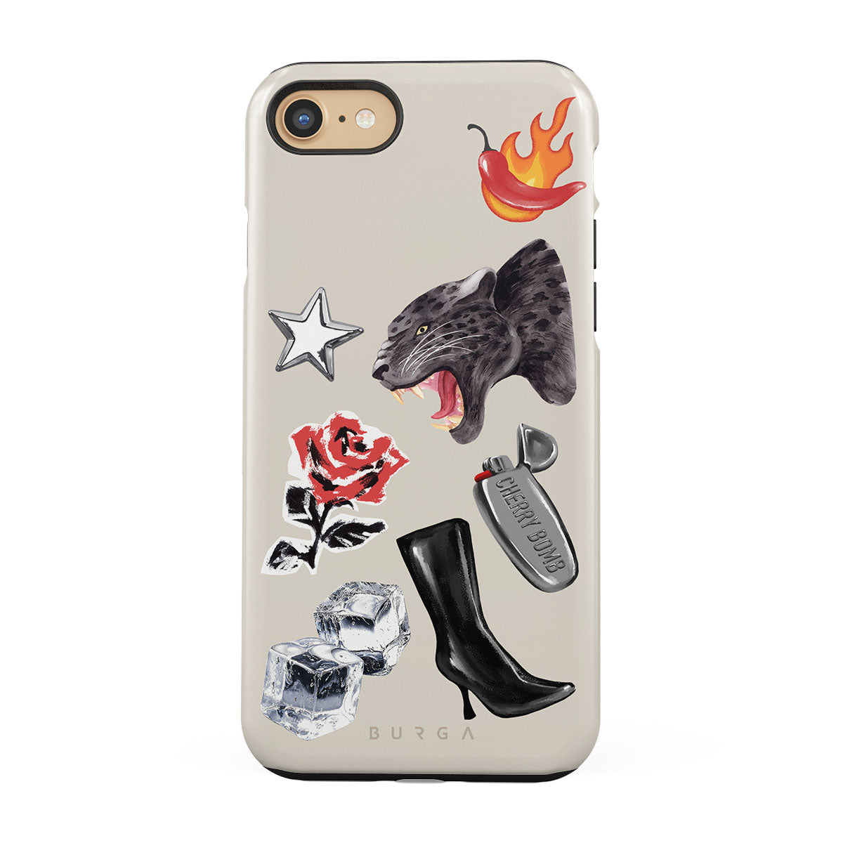 Questo design include: pantera nera, rosa rossa, peperone in fiamme, accendino argento, stivali neri alti, cubetti di ghiaccio, stella d’argento.