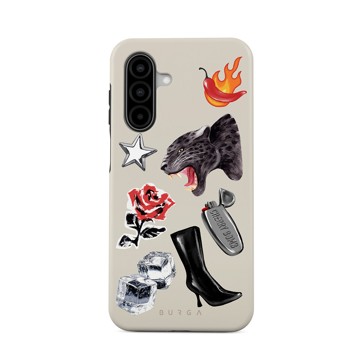 Questo design include: pantera nera, rosa rossa, peperone in fiamme, accendino argento, stivali neri alti, cubetti di ghiaccio, stella d’argento.