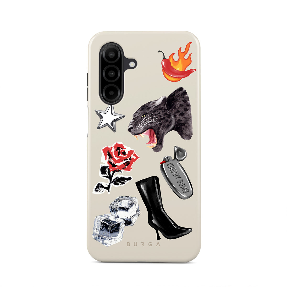 Questo design include: pantera nera, rosa rossa, peperone in fiamme, accendino argento, stivali neri alti, cubetti di ghiaccio, stella d’argento.
