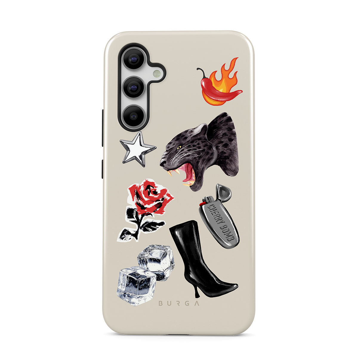 Questo design include: pantera nera, rosa rossa, peperone in fiamme, accendino argento, stivali neri alti, cubetti di ghiaccio, stella d’argento.