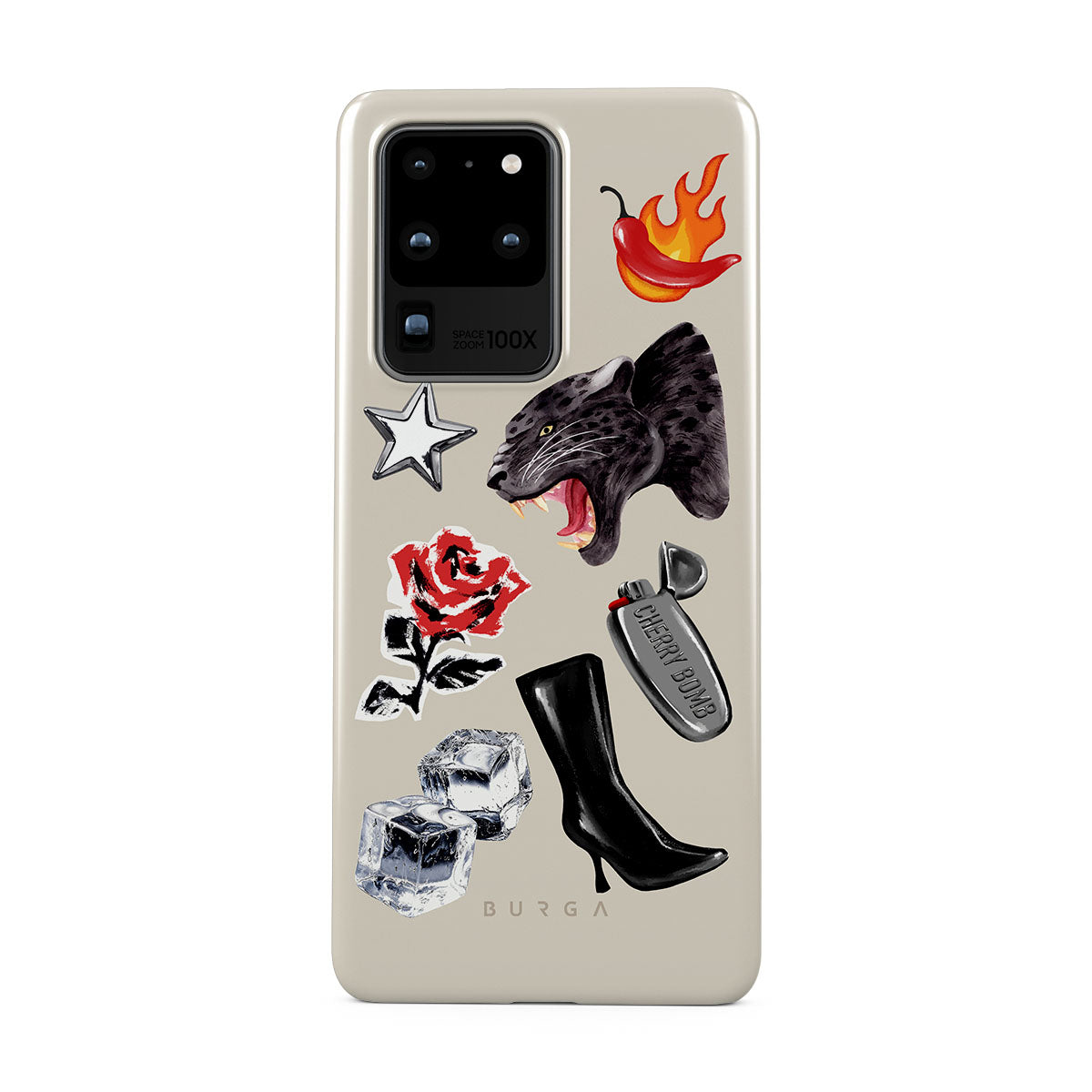 Questo design include: pantera nera, rosa rossa, peperone in fiamme, accendino argento, stivali neri alti, cubetti di ghiaccio, stella d’argento.