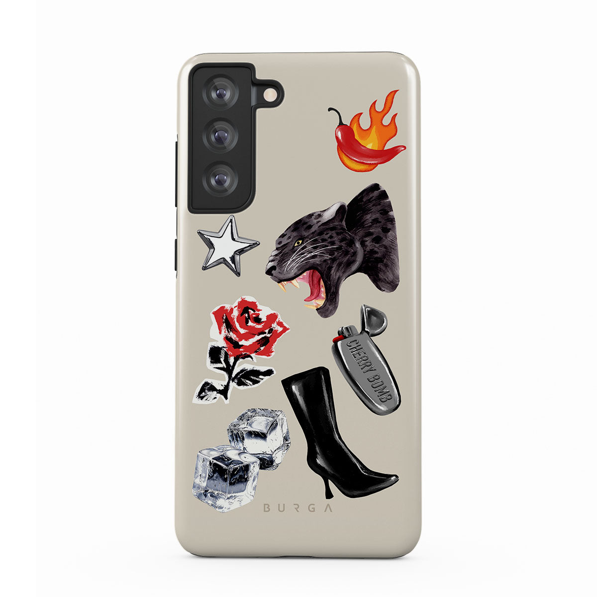 Questo design include: pantera nera, rosa rossa, peperone in fiamme, accendino argento, stivali neri alti, cubetti di ghiaccio, stella d’argento.