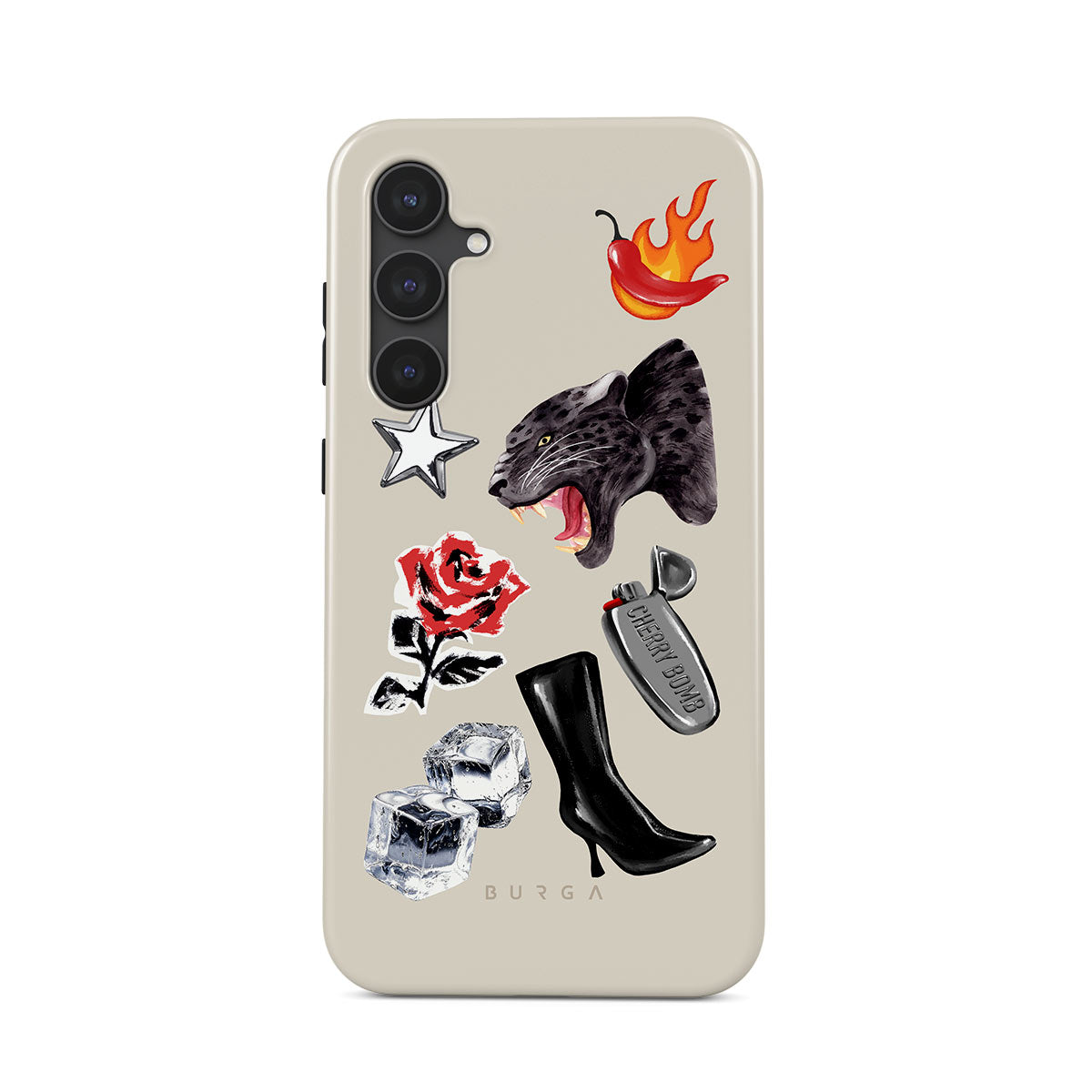 Questo design include: pantera nera, rosa rossa, peperone in fiamme, accendino argento, stivali neri alti, cubetti di ghiaccio, stella d’argento.