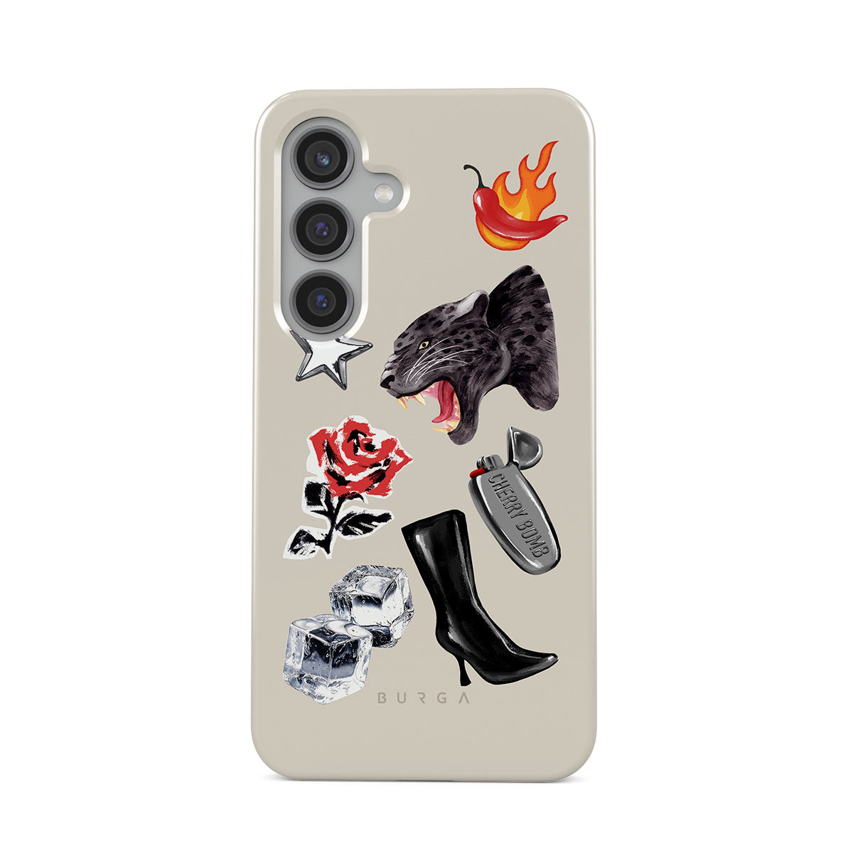 Questo design include: pantera nera, rosa rossa, peperone in fiamme, accendino argento, stivali neri alti, cubetti di ghiaccio, stella d’argento.
