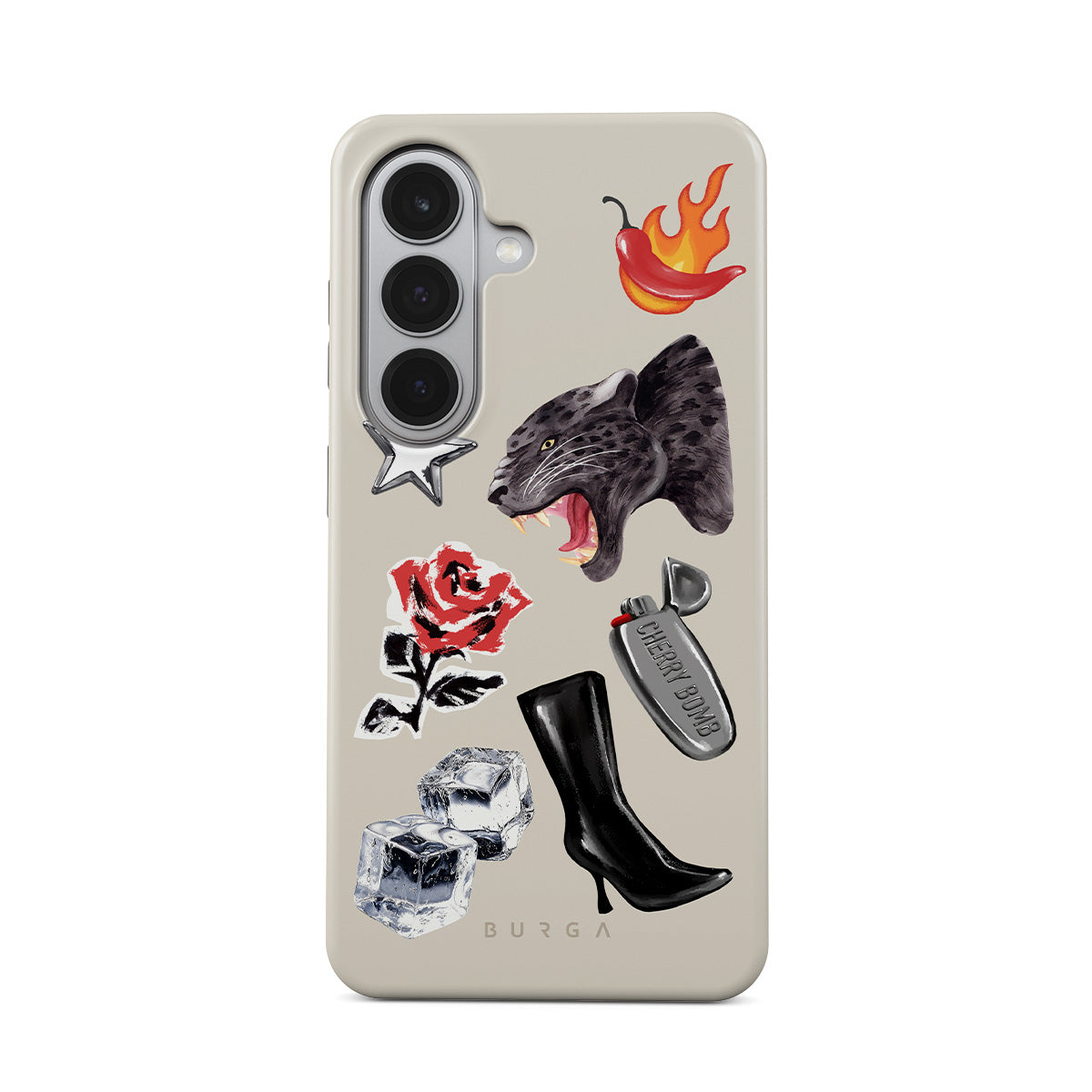 Questo design include: pantera nera, rosa rossa, peperone in fiamme, accendino argento, stivali neri alti, cubetti di ghiaccio, stella d’argento.