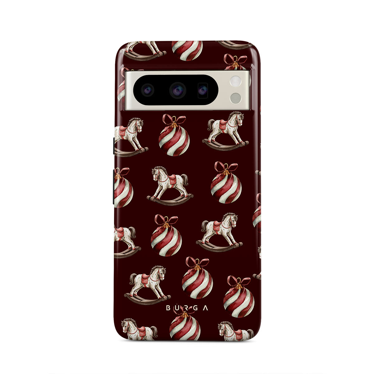 Elementi distintivi: cavallucci a dondolo, palline, rosso, decorazione natalizia