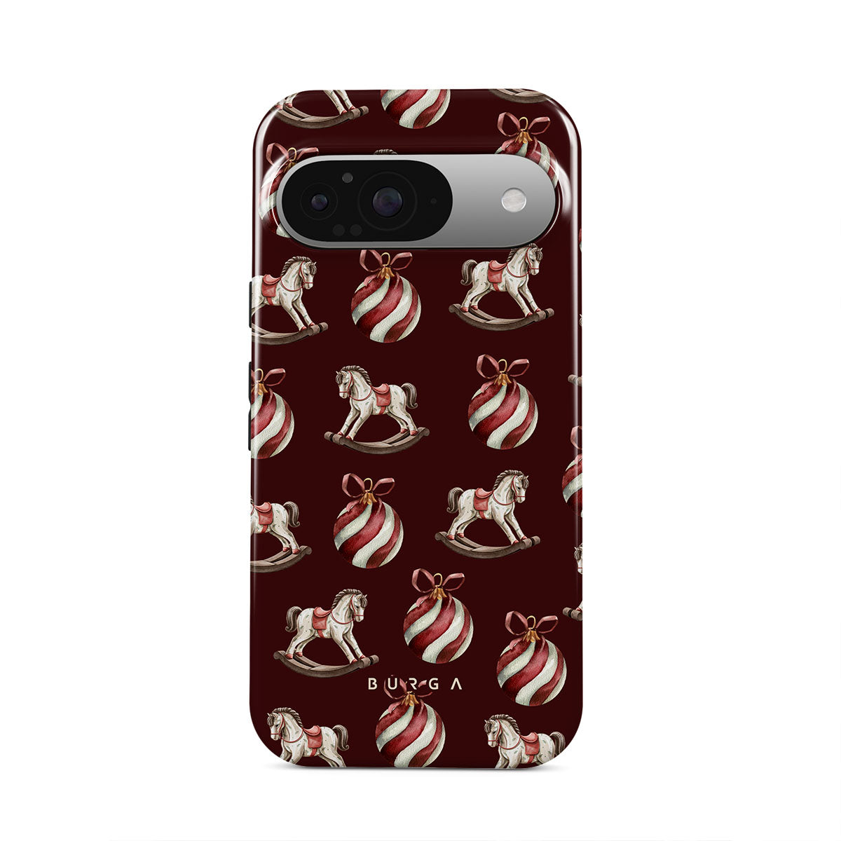 Elementi distintivi: cavallucci a dondolo, palline, rosso, decorazione natalizia