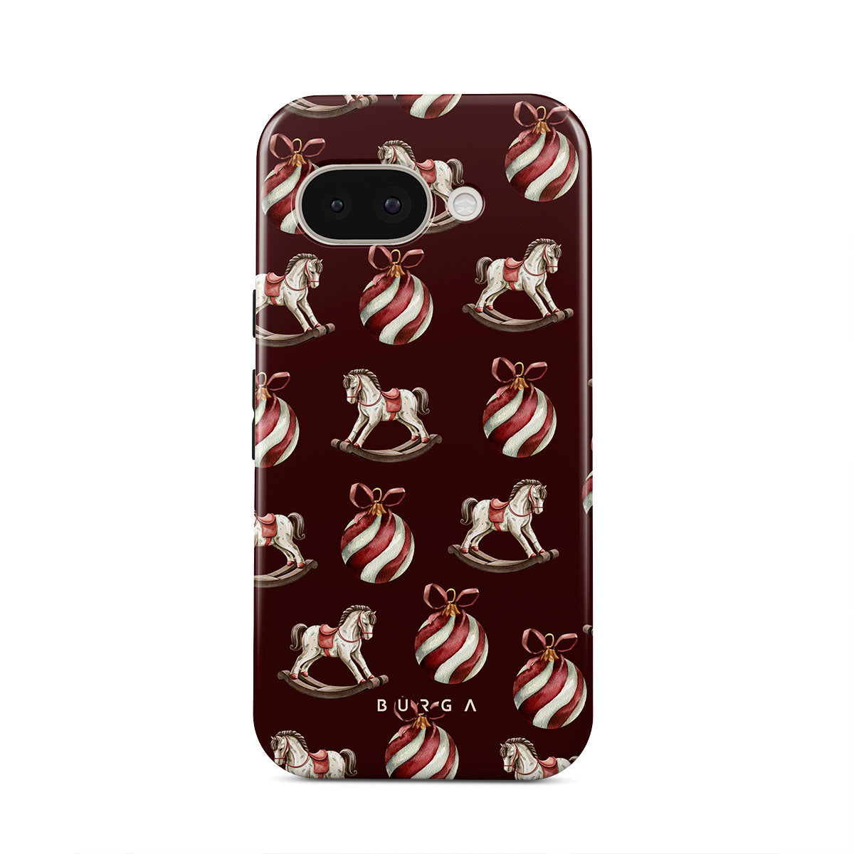 Elementi distintivi: cavallucci a dondolo, palline, rosso, decorazione natalizia
