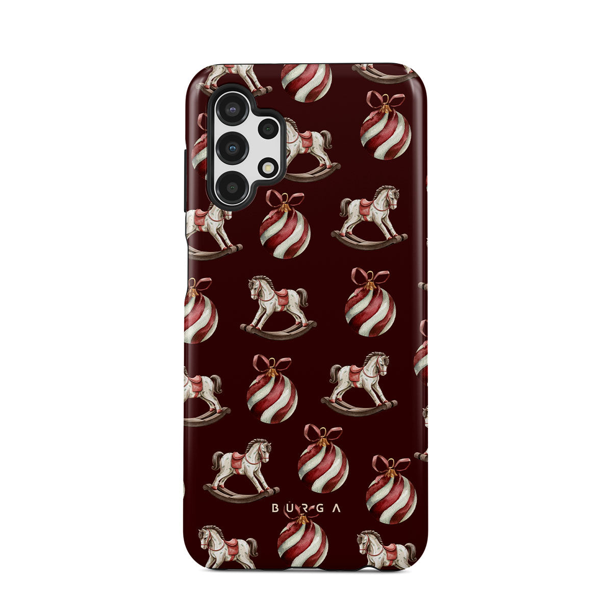 Elementi distintivi: cavallucci a dondolo, palline, rosso, decorazione natalizia